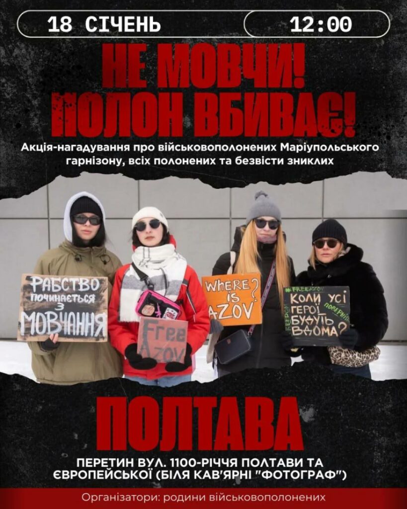 Акція нагадування відбудеться 18 січня біля кавʼярні «Фотограф» о 12:00, де збирають учасників. Про це повідомила полтавська спільнота родин захисників «Азовсталі» та Маріуполя 16 січня.