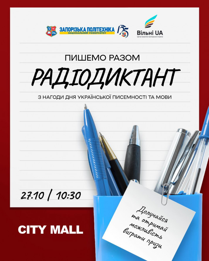 “У цей день диктант напишуть студенти та викладачі Національного університету “Запорізька політехніка”, співробітники ТРК CITY MALL — тож долучайтеся і ви!” – повідомили на сторінці ТРК у фейсбуці.