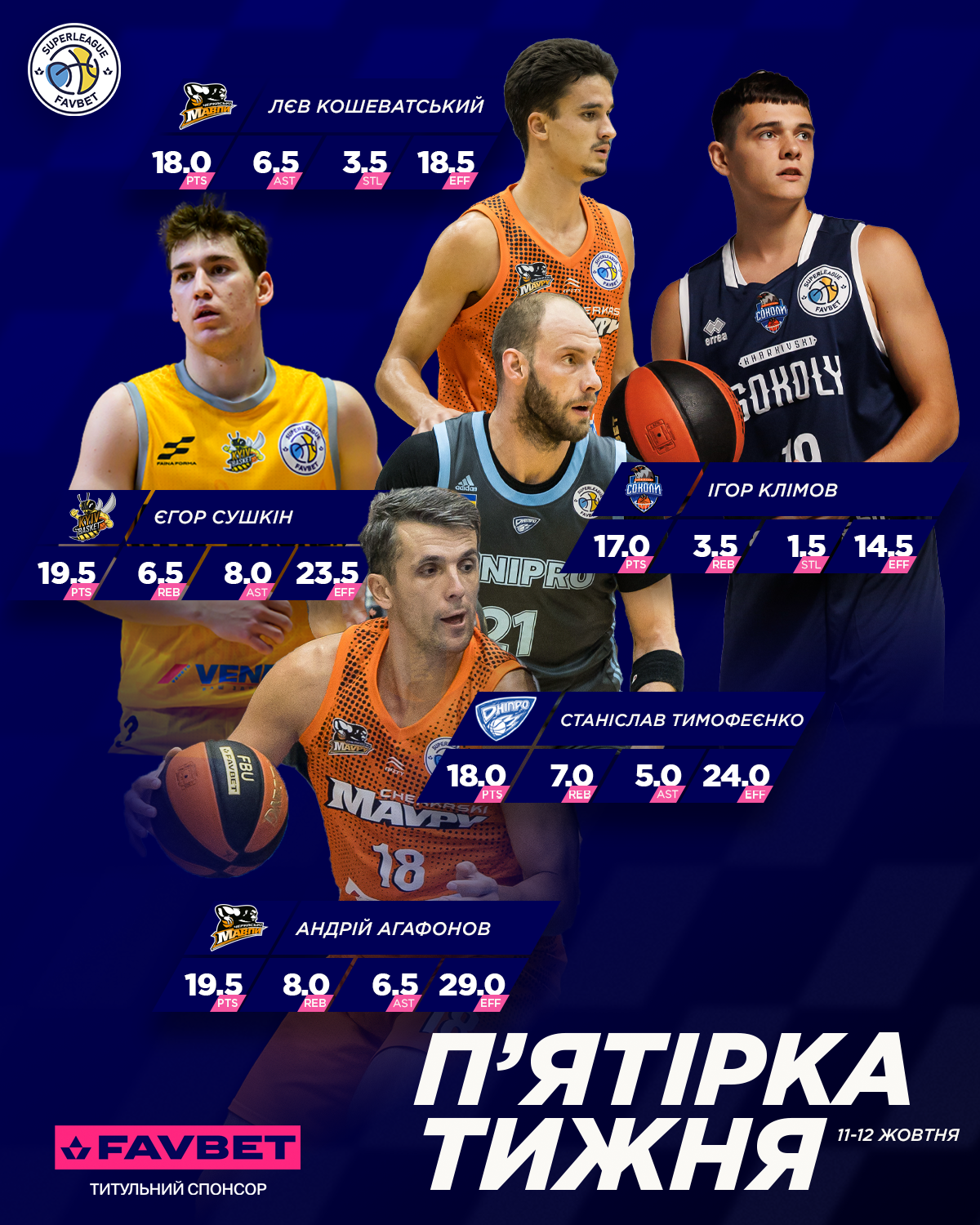 Єгор Сушкін (Київ-Баскет, 2 матчі) — 19.5 очка, 8.0 передачі, 6.5 підбирання (РЕ 23.5)