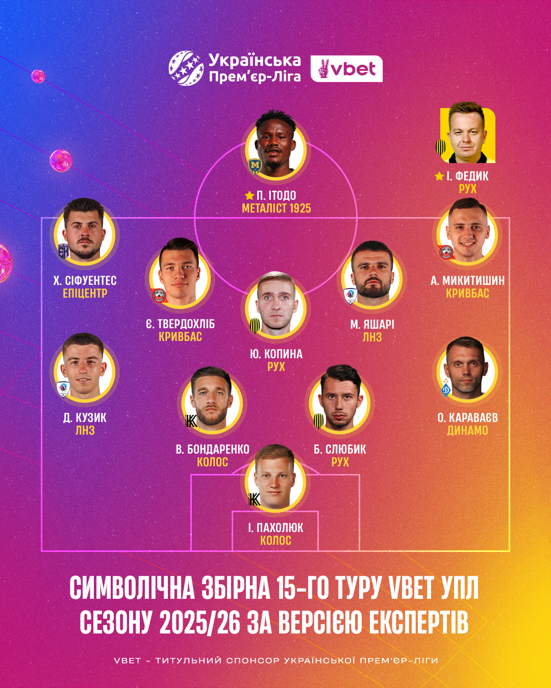 Українська Прем’єр-Ліга продовжує відзначати героїв сезону 2025/26 і після догравання матчу «Металіст 1925» — «Верес» склала символічну збірну 15-го туру Чемпіонату УПЛ, а також назвала найкращого футболіста та найкращого тренера 15-го туру. Традиційно це було зроблено разом з ведучими, експертами, коментаторами УПЛ.ТБ та представниками провідних спортивних ЗМІ України. Цього разу їх було 35.