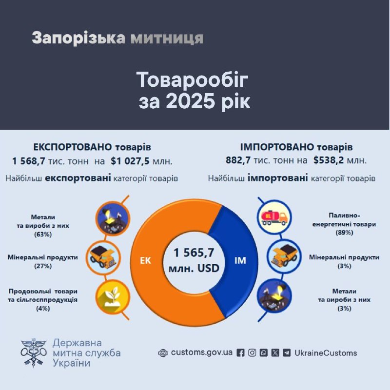 Зовнішньоторговельний товарообіг Запорізької митниці у 2025 році становив Обсяг експортних операцій досяг 1 027,5 млн доларів, імпортних — 882,7 млн доларів.