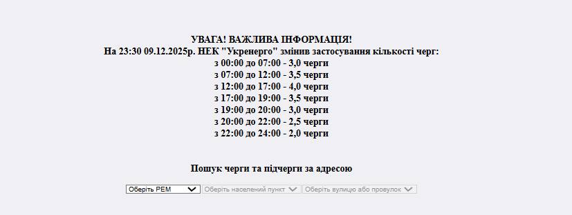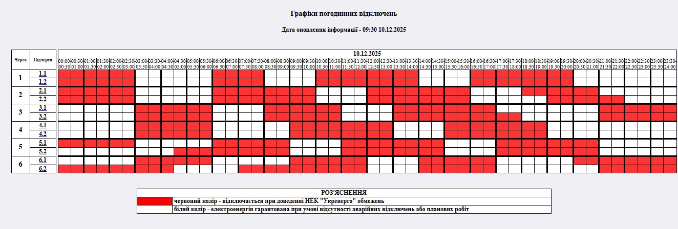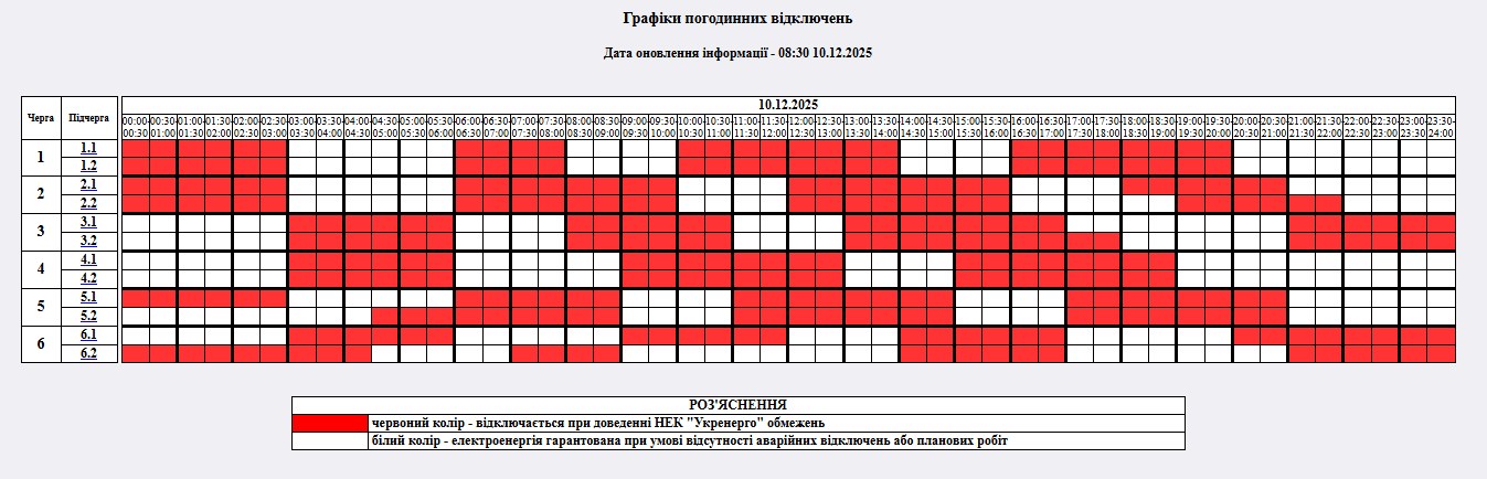 - Графіки погодинних відключень з 00:00 до 23:59 – обсягом від 2 до 4 черг;