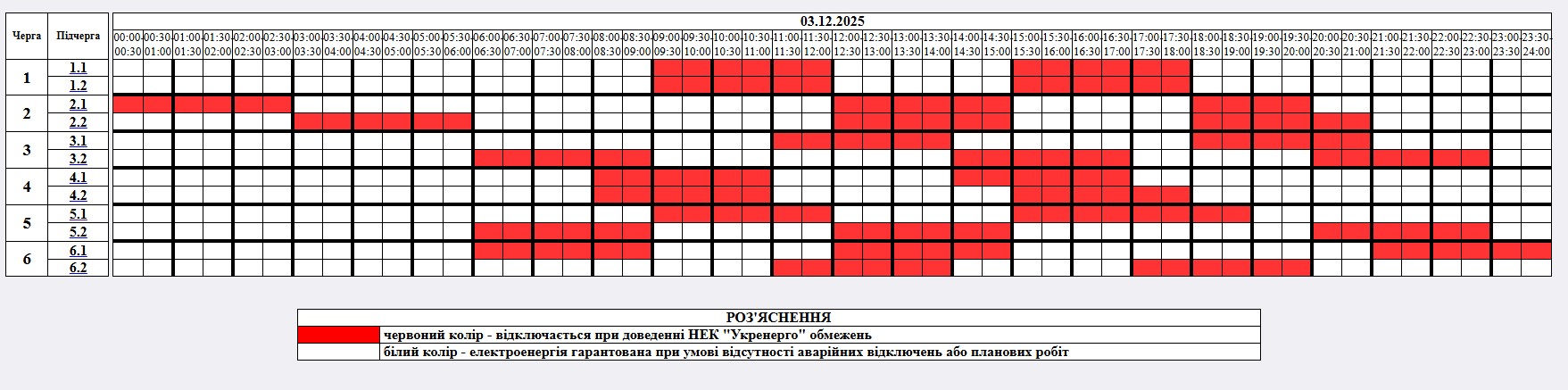 - Графіки погодинних відключень з 00:00 до 23:59 – від 0,5 до 3 черг;