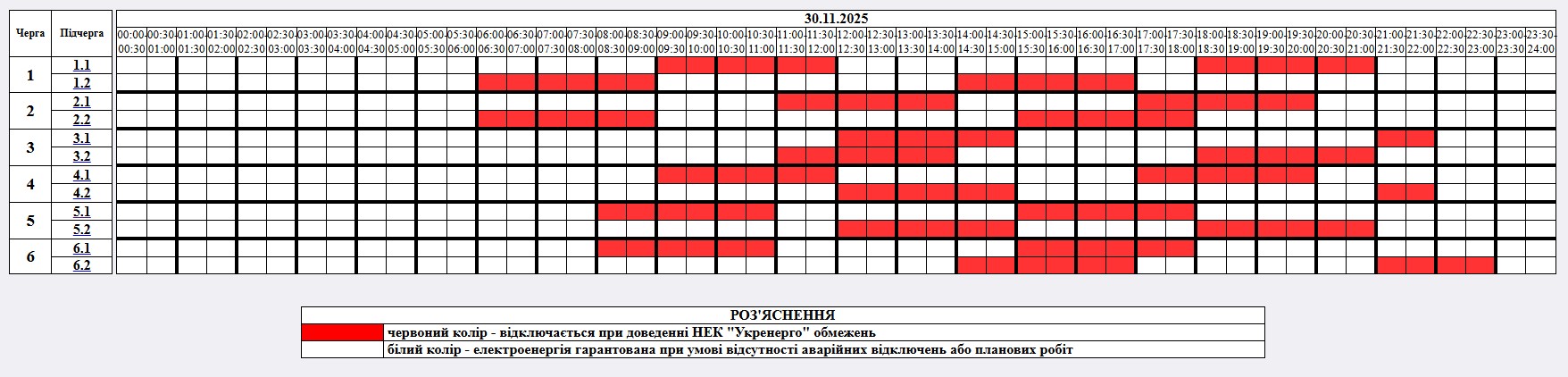 - Графіки погодинних відключень з 00:00 до 23:59 – від 0,5 до 3 черг (з максимальним обсягом обмежень у вечірні години);
