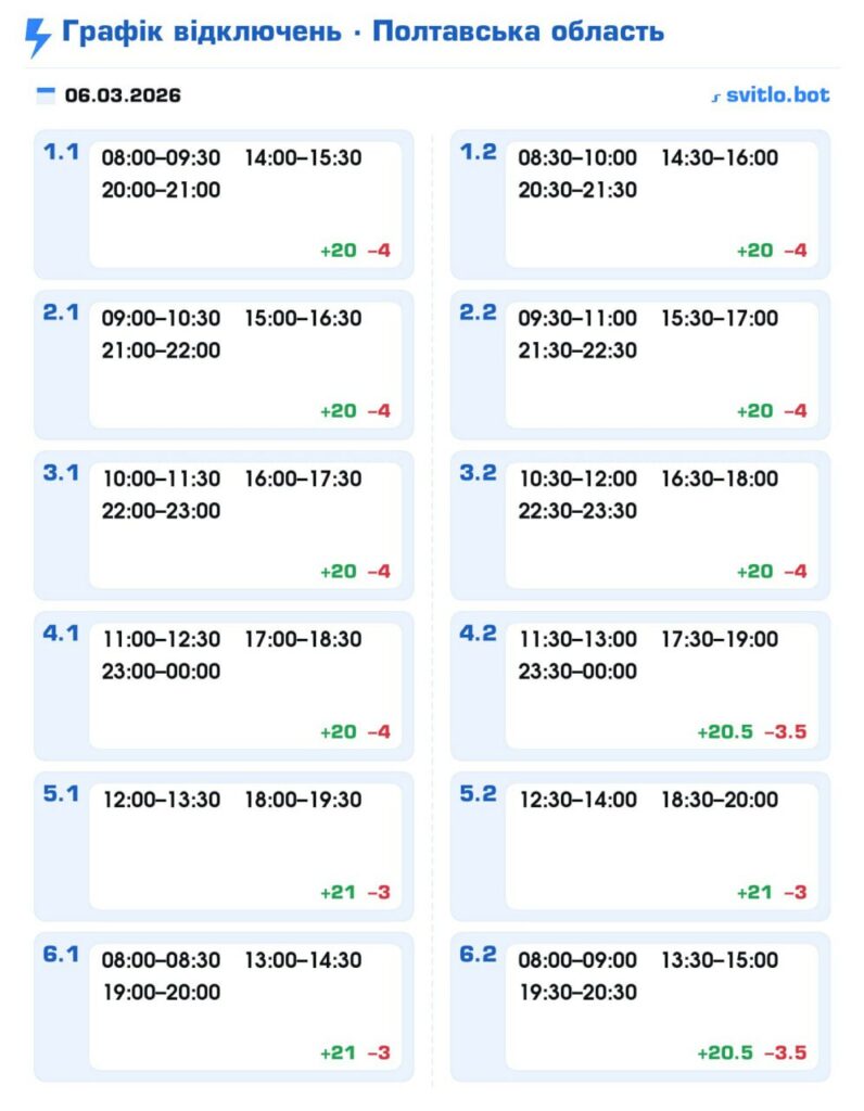 Енергосистема лишається під тиском, проте графік відключень світла на Полтавщині на 6 березня – послабили.