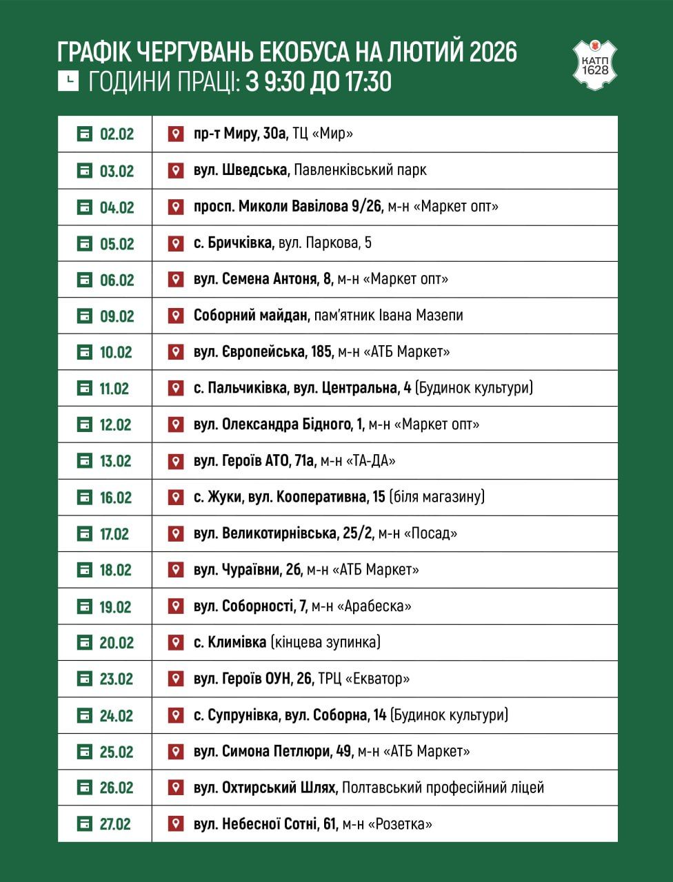 Графік чергування екобуса у лютий 2026 року: