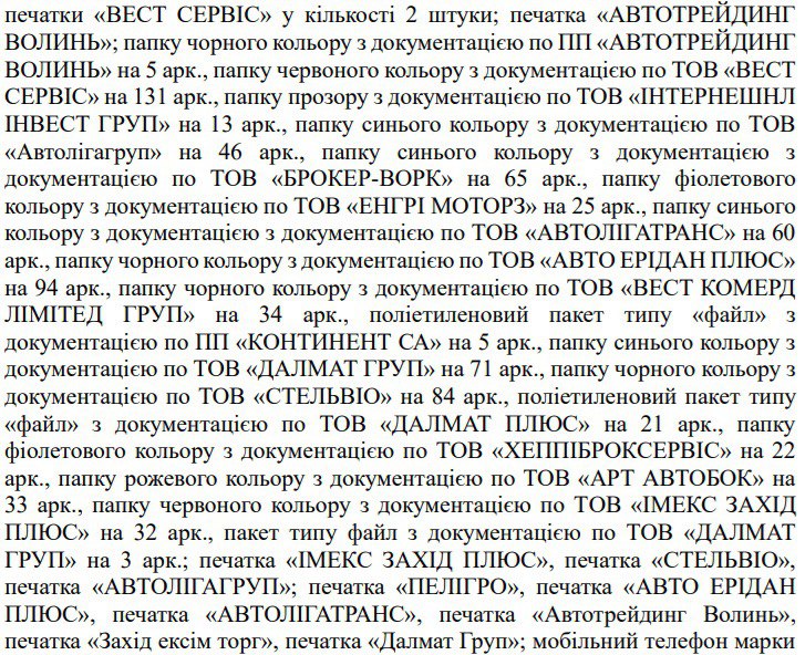 У квартирі Ігоря слідчі працювали з 8:23 до 13:27. Там вилучили сім захищених носіїв електронного підпису — фактично ключі доступу до реєстру. Знайшли печатки дев’яти компаній, серед них «ВЕСТ СЕРВІС» і «АВТОТРЕЙДІНГ ВОЛИНЬ». Документації було настільки багато, що її рахували аркушами — понад сімсот. Матеріали стосувалися діяльності п’ятнадцяти фірм.