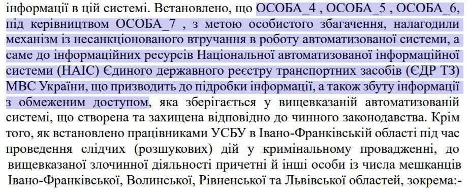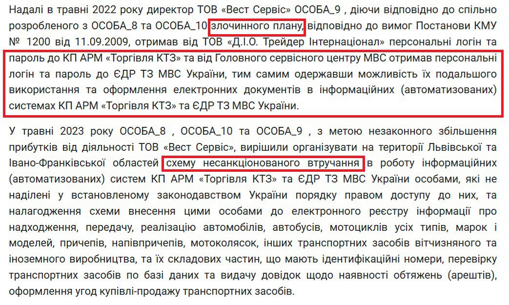 - Технічну частину забезпечував Олег — він клонував ключі доступу до ЄДР ТЗ МВС України, які були видані ТОВ «ВЕСТ СЕРВІС» та іншим підконтрольним фірмам.