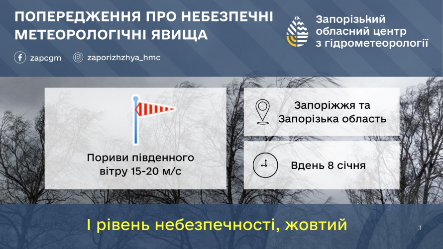 “Вдень 8 січня очікуються пориви південного вітру 15-20 м/с (І рівень небезпечності, жовтий). Погодні умови можуть призвести до пошкодження ліній електропередач, падіння дерев, заносу автомобілів, збільшення ймовірності ДТП”, – написали на сторінці Запорізького обласного центру з гідрометеорології у фейсбуці.