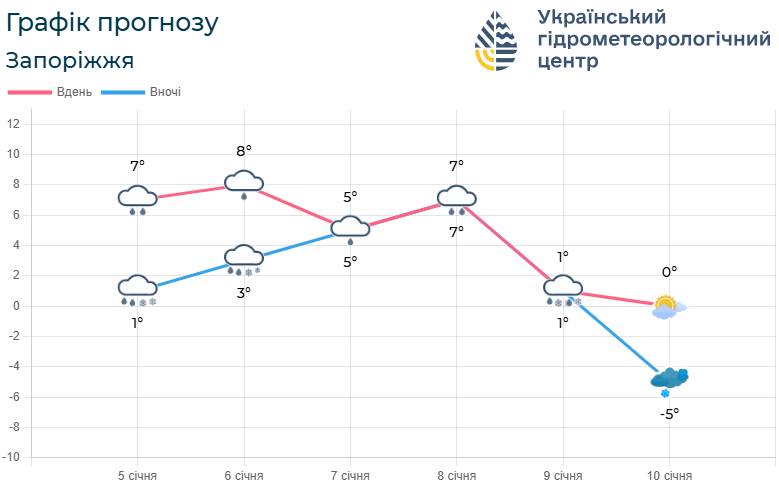 – 8 січня – вночі хмарно, мокрий сніг та дощ. Температура: +5°…+3°C. Вітер: Південно-Східний 7-12 м/с.