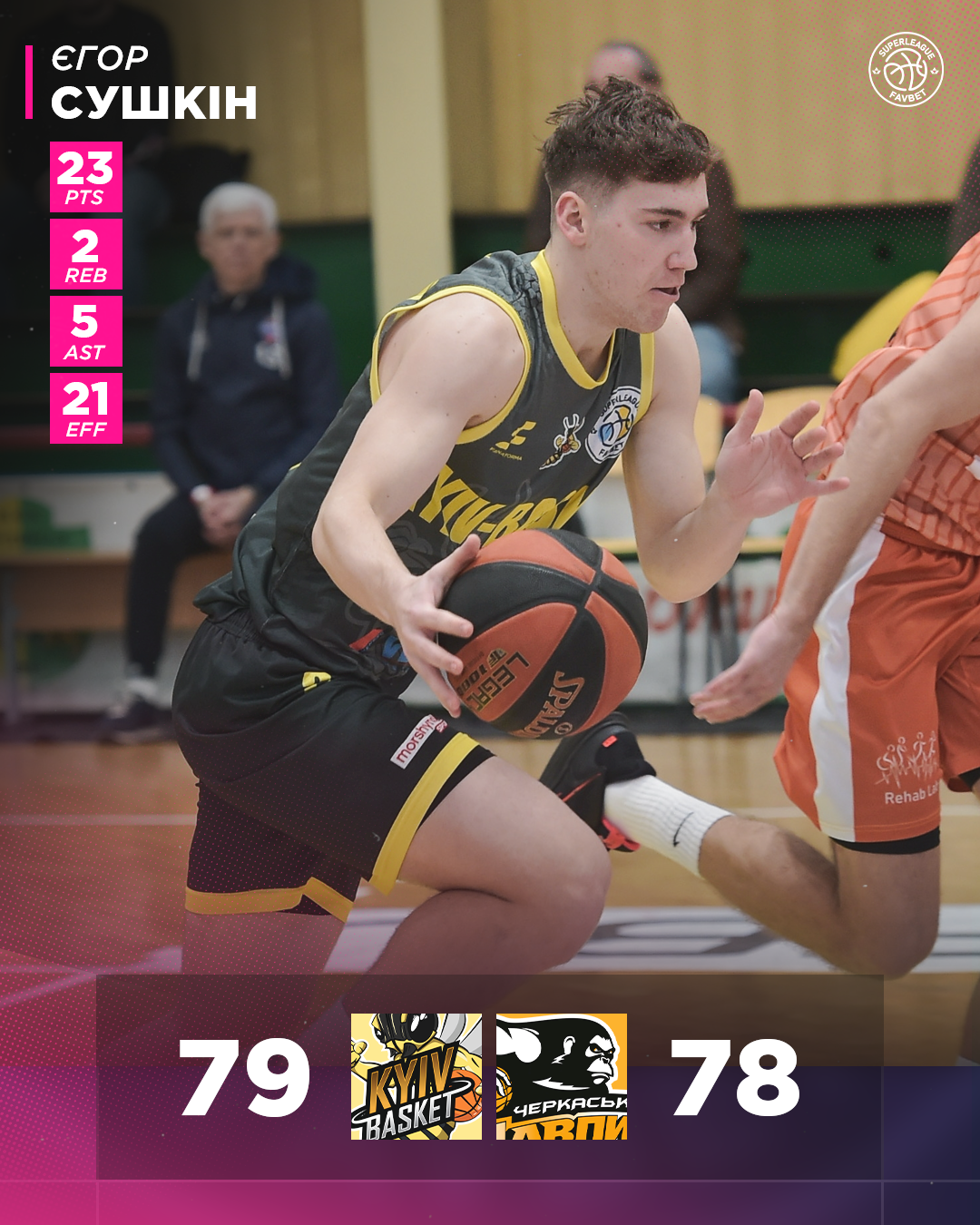 Та все ж кінцівка залишилась за Київ-Баскетом, який за останні дві хвилини не дозволив кинути жодного разу по своєму кільцю, натомість Єгор Сушкін спершу закинув дальній, далі після його невлучної трійки Клевзуник зловив м’яч і відправив його в сітку, а у вирішальний момент Клевзуник обікрав Агафонова, розпочав швидку атаку, яку флоутером завершив Сушкін.