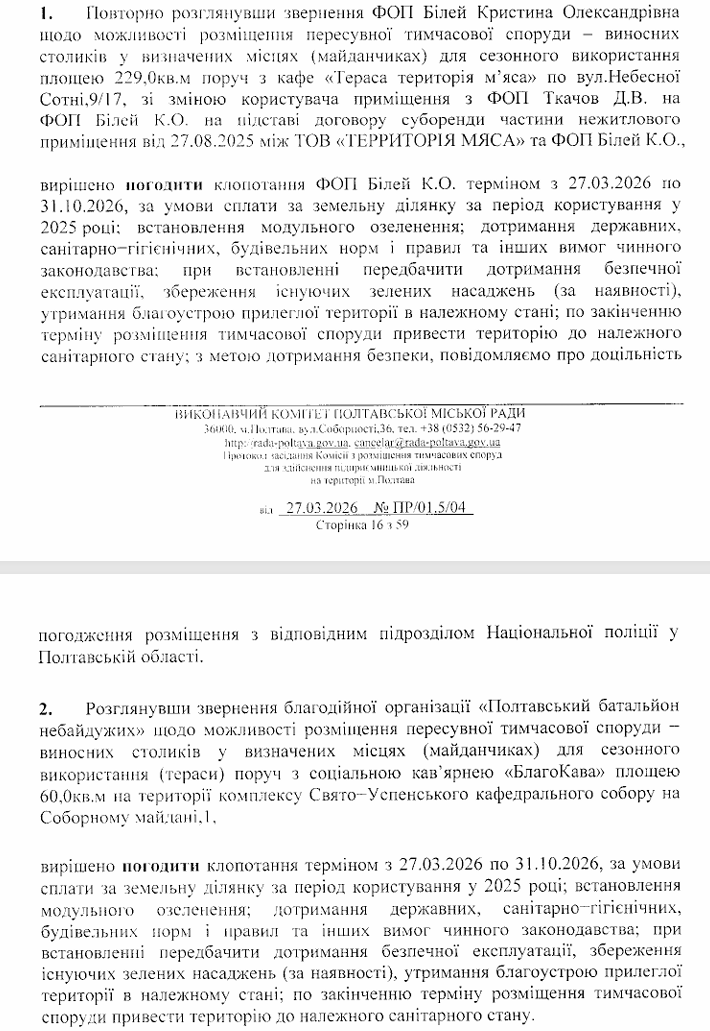Аналогічне рішення ухвалили і щодо соціальної кав’ярні «БлагоКава» (БО «Полтавський батальйон небайдужих»). Комісія погодила розміщення тераси площею 60 кв.м на території комплексу Свято-Успенського кафедрального собору (Соборний майдан, 1) також до кінця жовтня 2026 року.