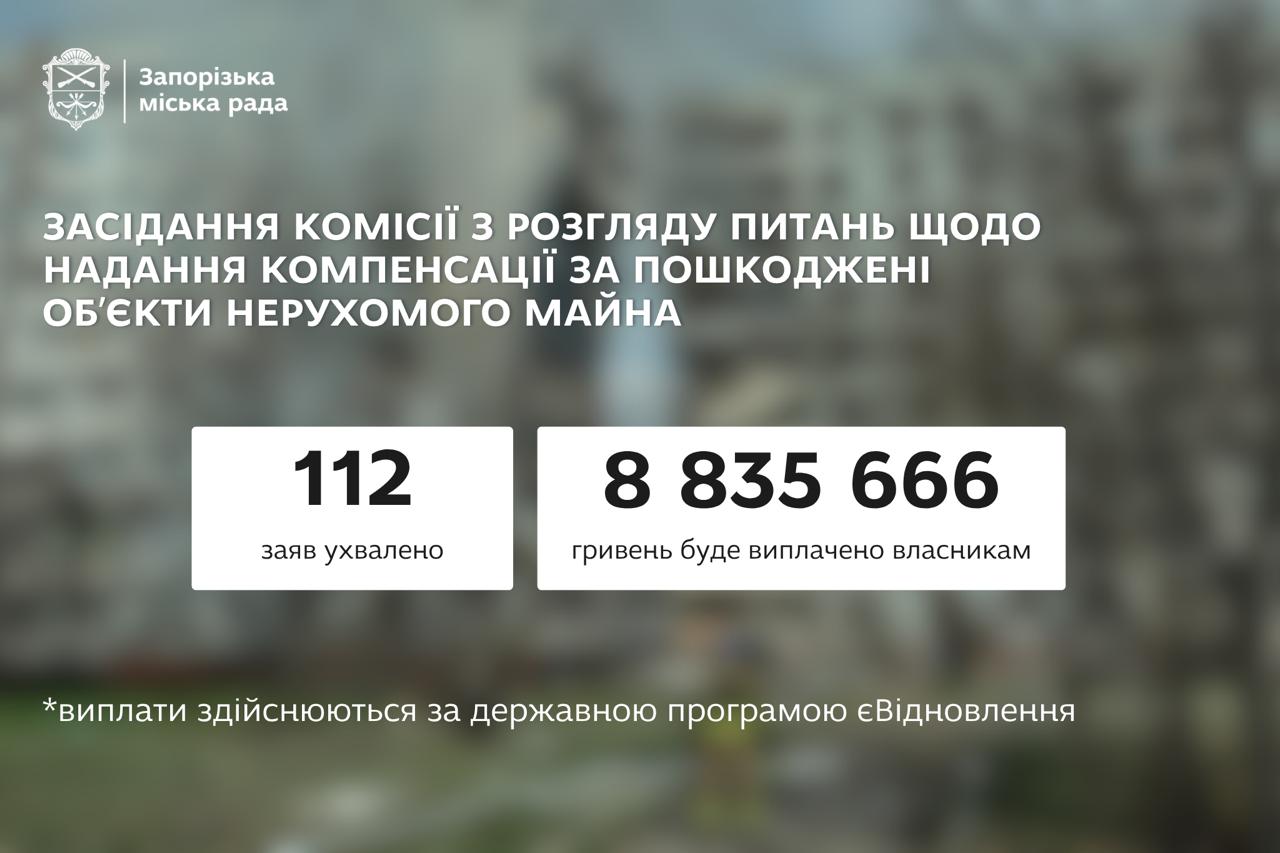 У четвер, 26 березня, відбулось чергове засідання комісії з розгляду питань щодо надання компенсації за пошкоджені об’єкти нерухомого майна внаслідок бойових дій, терористичних актів, диверсій, спричинених збройною агресією російської федерації проти України у м. Запоріжжя. На ньому погодили отримання компенсації за 112 заявками на суму 8 мільйонів 835 тисяч 666 гривень.