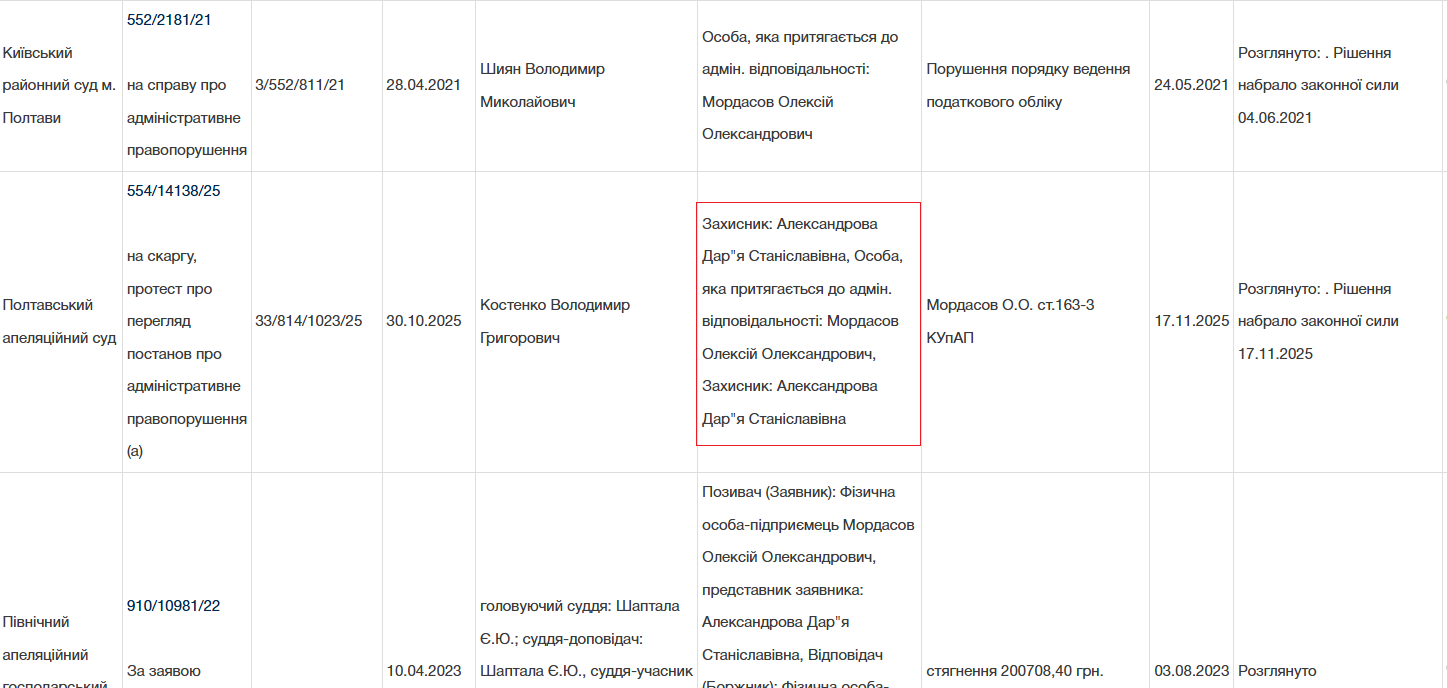З 2016 року учасниця тендеру Дар’я Александрова працювала юристкою на підприємствах Олексія Мордасова, також вона представляла його інтереси в судах.