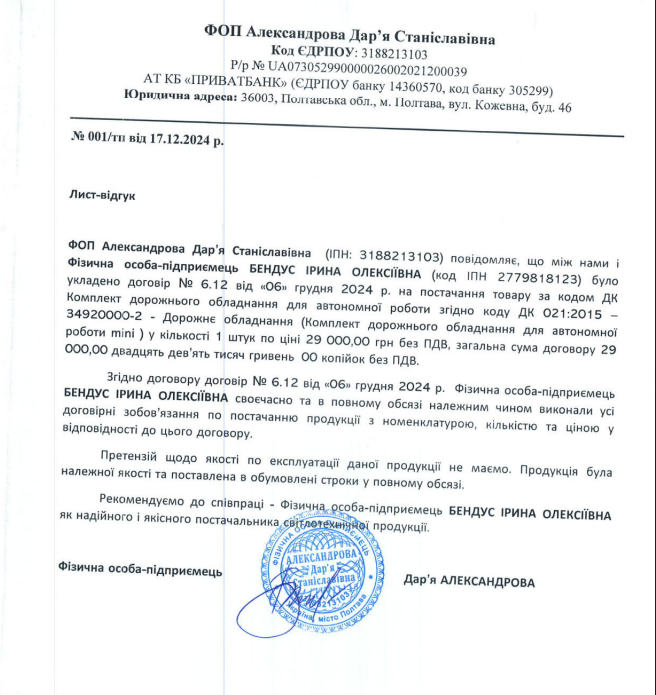 Для участі у цих закупівлях позитивні листи-відгуки про вдалу співпрацю з ФОП Іриною Бендус також надала колишня колега Решетила по «Смарт Лайт Груп» і учасниця іншого тендера — Дар’я Александрова. Вона повідомила, що була задоволена оперативністю отримання та якістю дорожнього обладнання для автономної роботи вартістю 29 тис. грн, а також двома шафами управління зовнішнім освітленням із передачею даних на пульт за 12 тис. грн, які придбала у Бендус.