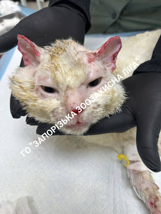 У Запоріжжі рятують котика на ім’я Буся, який дивом вижив після влучання ворожого дрона в житловий будинок. Під час атаки “шахеда” тварина отримала тяжкі опіки — шерсть майже повністю згоріла, сильно постраждали лапки, мордочка та очі. У критичному стані Бусю доправили до ветеринарної клініки.