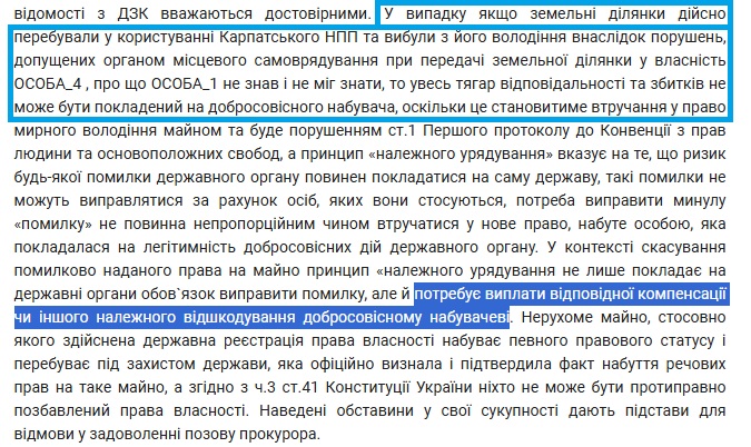 Один із найпоказовіших прикладів — Карпатський національний природний парк. Там землі заповідного фонду передавали у приватну власність без вилучення, без погоджень із центральними органами влади та без зміни меж парку. У результаті такі ділянки кілька разів перепродавалися, а кінцеві набувачі вважали себе «добросовісними власниками», які нібито законно придбали землю.