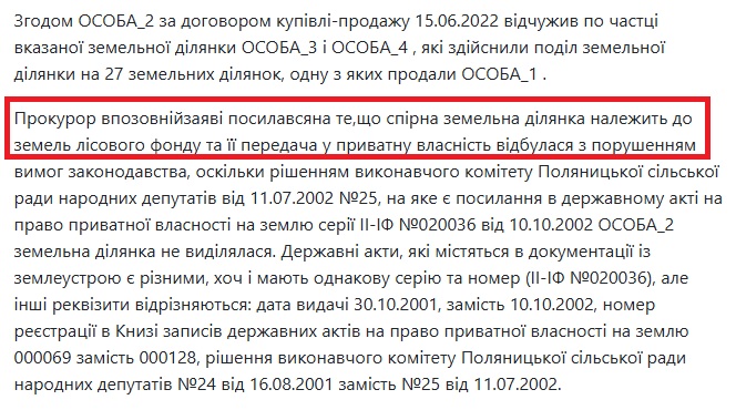 З позиції позивача йдеться про сумнівну приватизацію, що бере початок ще на початку 2000-х років. За версією прокуратури, тоді було підроблено державний акт на право приватної власності на земельну ділянку. У цьому документі зазначалося, що ділянку площею 0,85 га нібито передали для ведення особистого селянського господарства на підставі рішення виконкому сільської ради №25 від 11 липня 2002 року.
