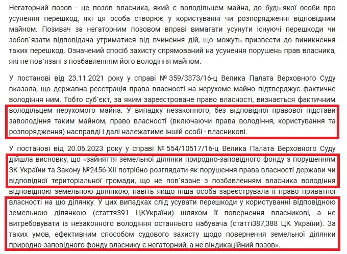 Велика Палата Верховного Суду у своїх постановах 2021–2023 років чітко пояснила логіку: для земель природно-заповідного фонду порушення прав власника є безперервними, тож саме негаторний спосіб захисту є найбільш відповідним.