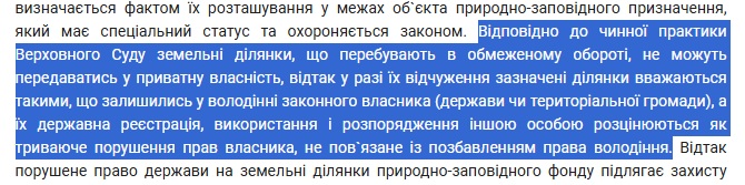 Але головне, що суд визнав: негаторний позов обрано правильно. Адже йдеться не про «витребування» майна, яке нібито вибуло з володіння держави, а про усунення перешкод у користуванні державною власністю. Це важливо, бо у випадку земель природно-заповідного фонду порушення тривають постійно — держава не втрачає права власності.