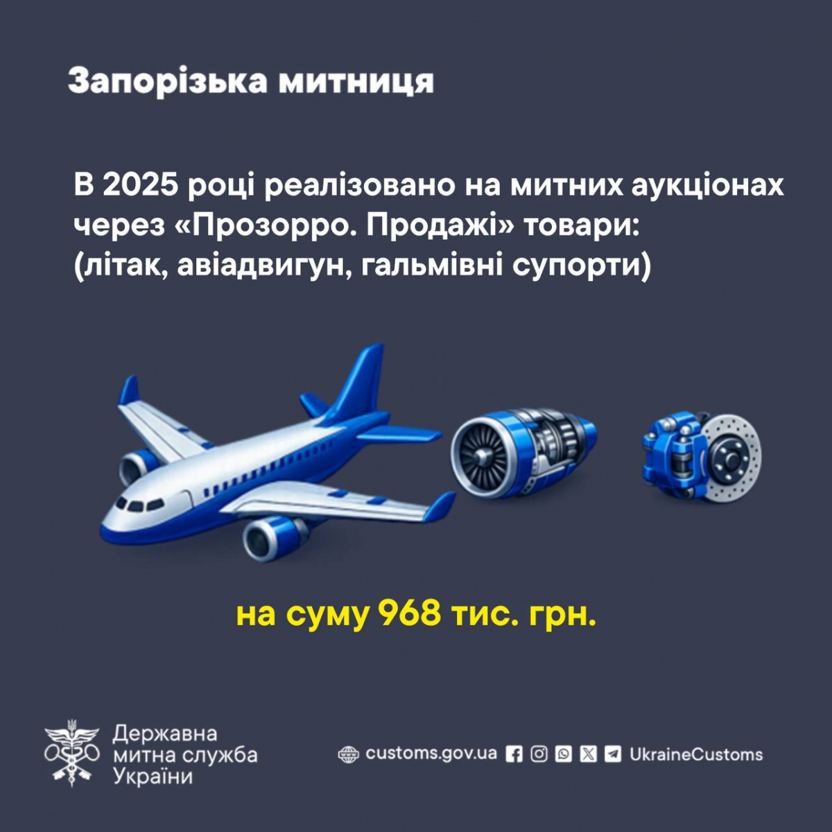 Водночас частину державного майна у 2025 році реалізували через митні аукціони в системі «Прозорро.Продажі». Серед лотів — літак, авіадвигун та гальмівні супорти. Загалом від продажу вдалося виручити 968 тисяч гривень.