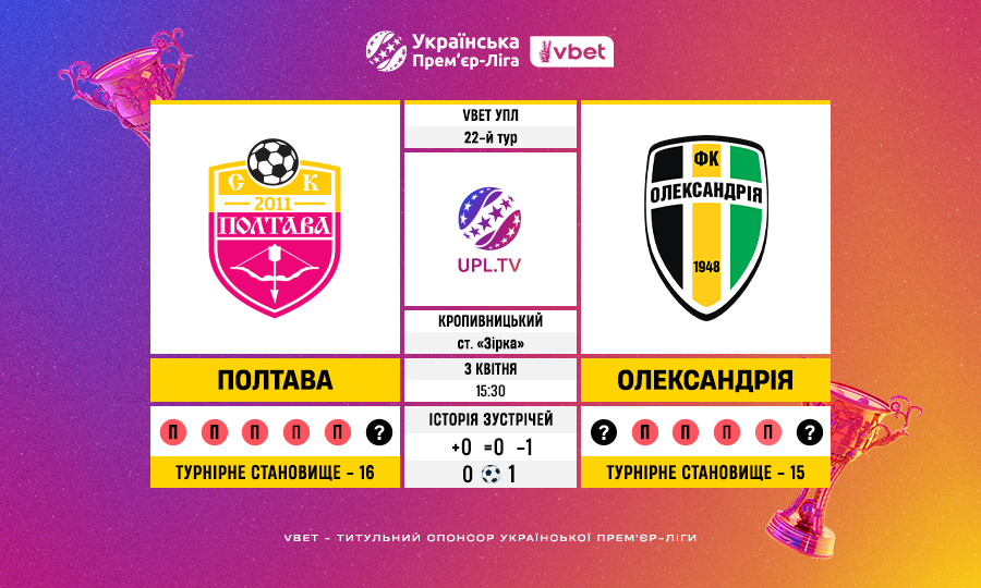 Матч 22-го туру VBET Української Прем’єр-Ліги «Полтава» — «Олександрія»: статистичне прев’ю