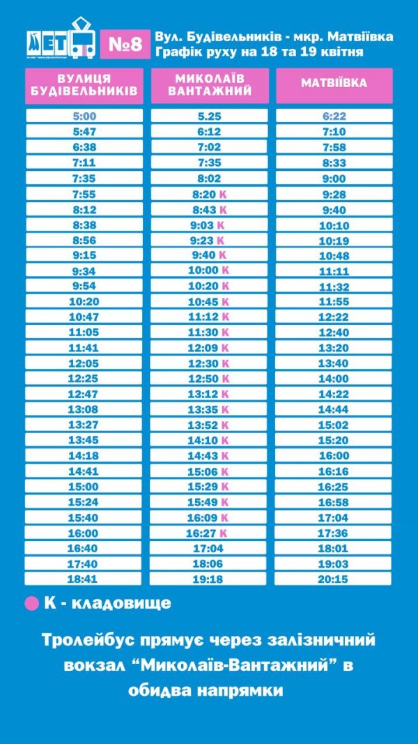 18 та 19 квітня тролейбуси маршруту №8 (вул. Будівельників – Матвіївка) працюватимуть за графіками, вказаними у світлинах, для того, щоб забезпечити менший час очікування транспорту для тих, хто планує відвідати Матвіївське кладовище.