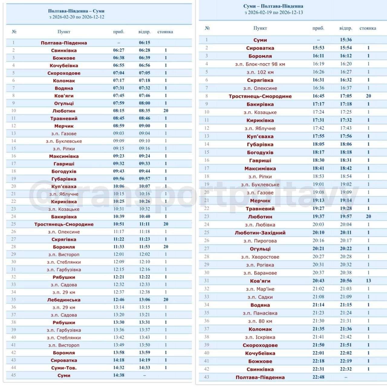 Потяг відправлятиметься зі станції Полтава-Південна щодня о 06:15 та прибуватиме до Сум о 14:38. У зворотному напрямку із Сум перший рейс стартує сьогодні о 15:36.