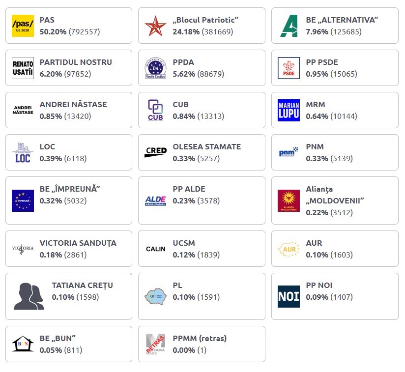 Отже, за даними ЦВК Молдови, партія чинної президентки Молдови Майї Санду “Дія і солідарність” (PAS) набрала абсолютну більшість – 50,2% голосів.