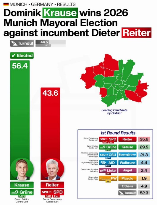 Мюнхен отримує «зеленого» мера – кандидата від лівої «Партії зелених». 34-річний Домінік Краузе впевнено переміг чинного мера Дітера Рейтера з «Соціал-демократичної партії Німеччини», який одразу ж за попередніми результатами визнав свою поразку.