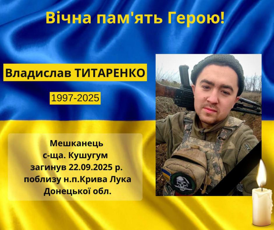 Кушугумська громада Запорізького району оплакує загиблого Героя. Мешканець селища Кушугум Владислав Титаренко віддав життя за Україну 22 вересня 2025 року у районі Кривої Луки Краматорського району Донецької області. Про це повідомили у громаді.
