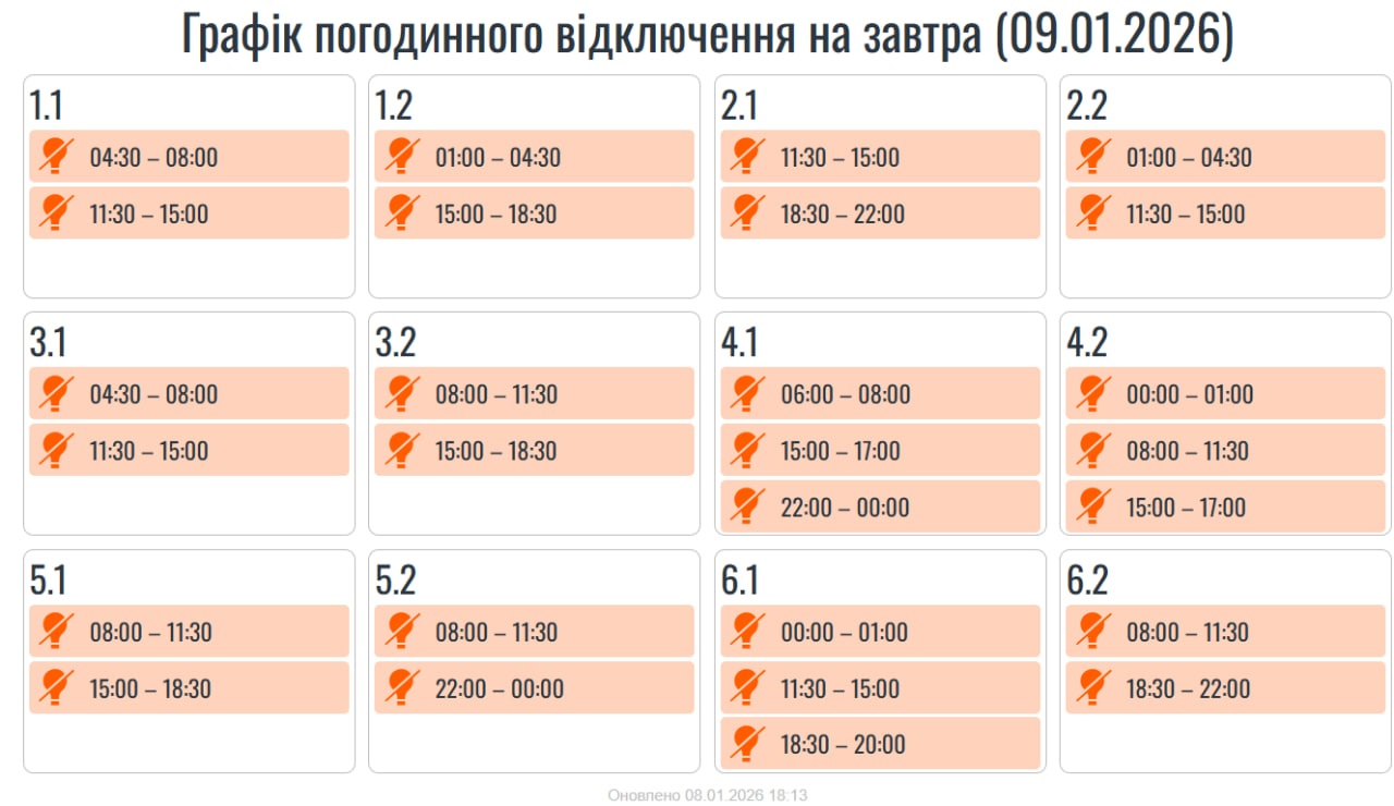 У п’ятницю, дев’ятого січня, на Прикарпатті діятимуть графіки погодинних вимкнень електроенергії.