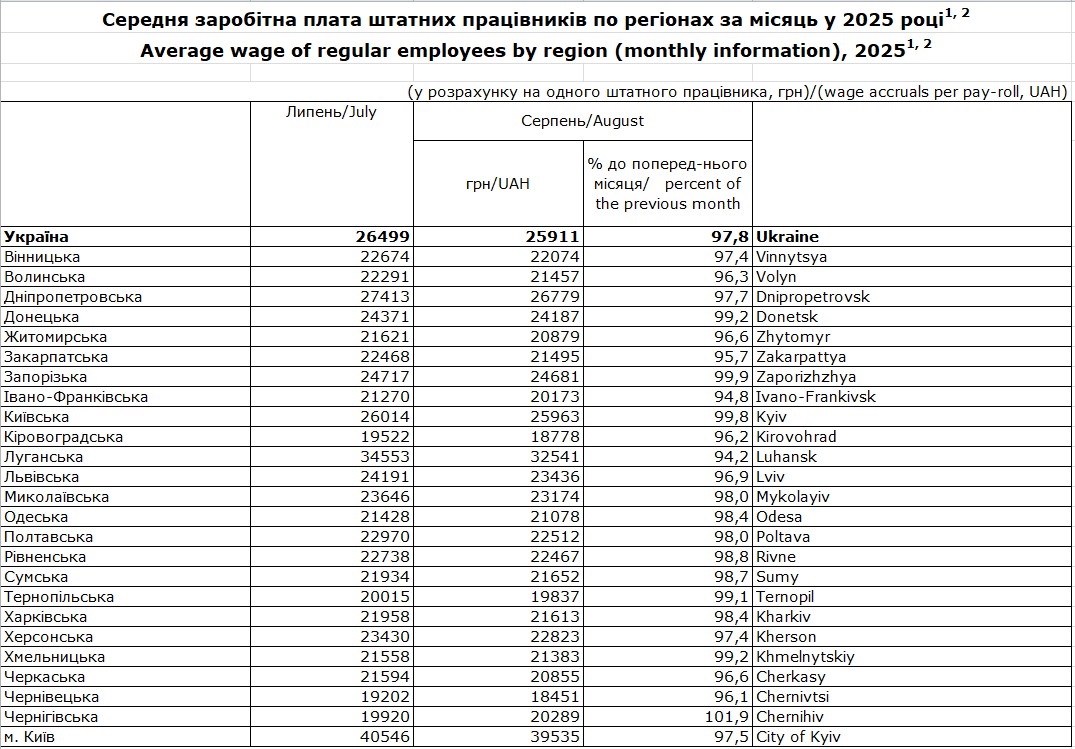 Найвищі середні зарплати зафіксовано у Києві — 39 535 грн, Луганській області — 32 541 грн, та Дніпропетровській — 26 779 грн. Найнижчі показники спостерігаються у Чернівецькій (18 451 грн) та Кіровоградській (18 778 грн) областях.