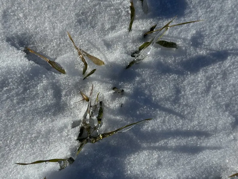 Льодовий панцир на сходах озимої пшениці утворився через різку зміну погоди. Спочатку була відлига, далі дощ та різке зниження температури. Нині подекуди товщина льоду на полі сягає п’яти сантиметрів.