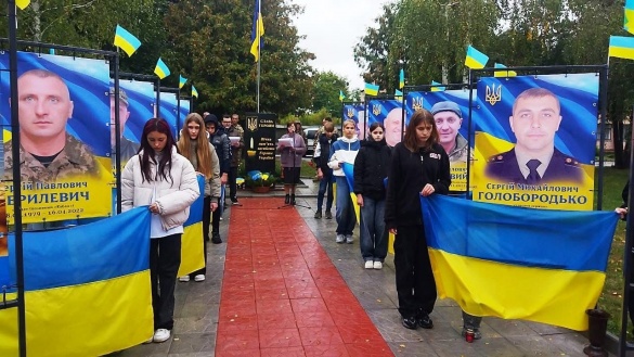 Під час церемонії розповіли про життєвий шлях кожного воїна. У момент згадування їхніх імен діти, які стояли у почесній варті, знімали державні прапори з банерів із портретами.