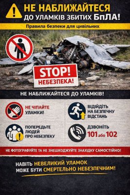 Пам’ятайте: навіть невеликий уламок може бути смертельно небезпечним. У разі виявлення підозрілих предметів негайно повідомляйте екстрені служби.
