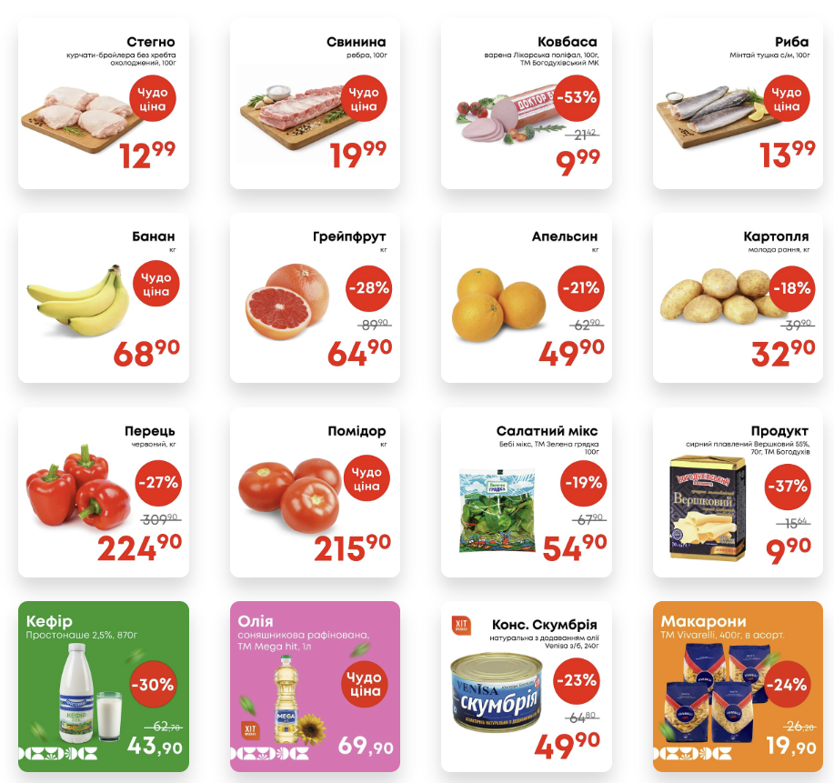 Цього тижня під акційні пропозиції потрапили товари з різних категорій. У супермаркеті відкритий великий вибір різноманітних товарів різних категорій. Полтавці можуть придбати зі знижками свіжу молочну продукцію, консерви, м’ясо або рибу.