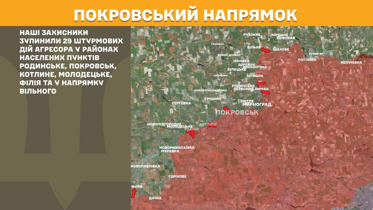 На Покровському напрямку наші захисники зупинили 29 штурмових дій агресора у районах населених пунктів Родинське, Покровськ, Котлине, Молодецьке, Філія та у напрямку Вільного.