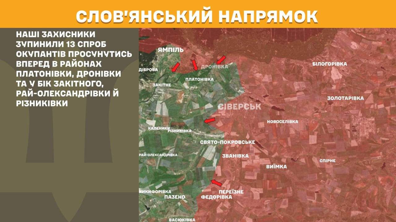 На Слов’янському напрямку протягом вчорашньої доби наші захисники зупинили 13 спроб окупантів просунутись вперед в районах Платонівки, Дронівки та у бік Закітного, Рай-Олександрівки й Різниківки.