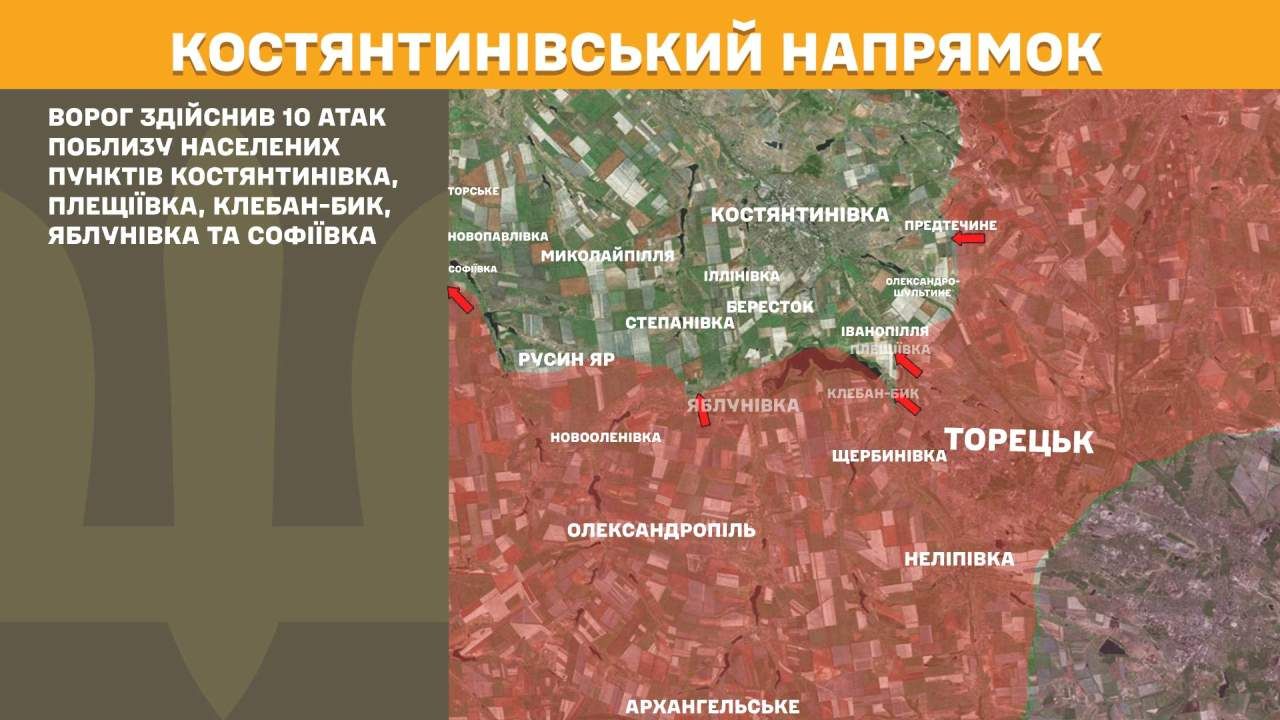 На Костянтинівському напрямку ворог здійснив 10 атак поблизу населених пунктів Костянтинівка, Плещіївка, Клебан-Бик, Яблунівка та Софіївка.