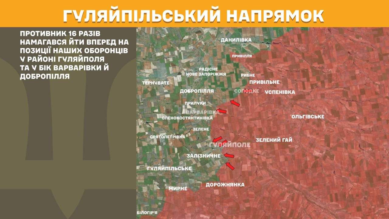 На Гуляйпільському напрямку противник 16 разів намагався йти вперед на позиції наших оборонців у районі Гуляйполя та у бік Варварівки й Добропілля.