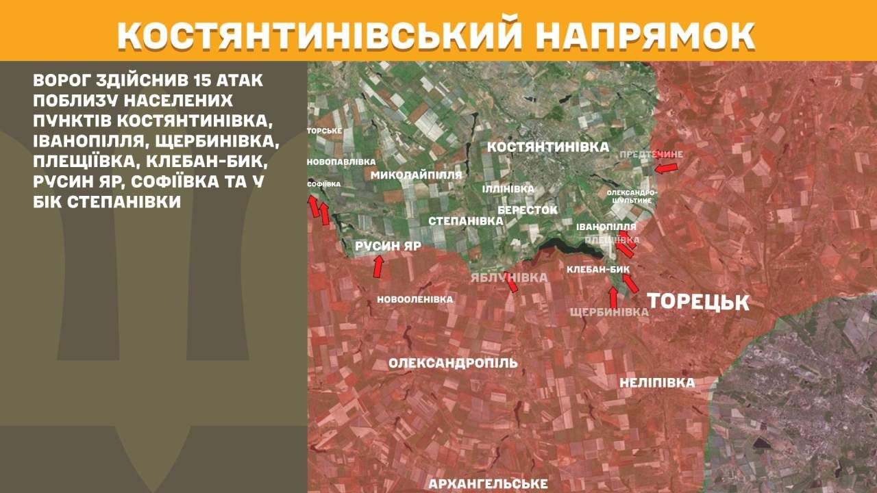 На Костянтинівському напрямку ворог здійснив 15 атак поблизу населених пунктів Костянтинівка, Іванопілля, Щербинівка, Плещіївка, Клебан-Бик, Русин Яр, Софіївка та у бік Степанівки.