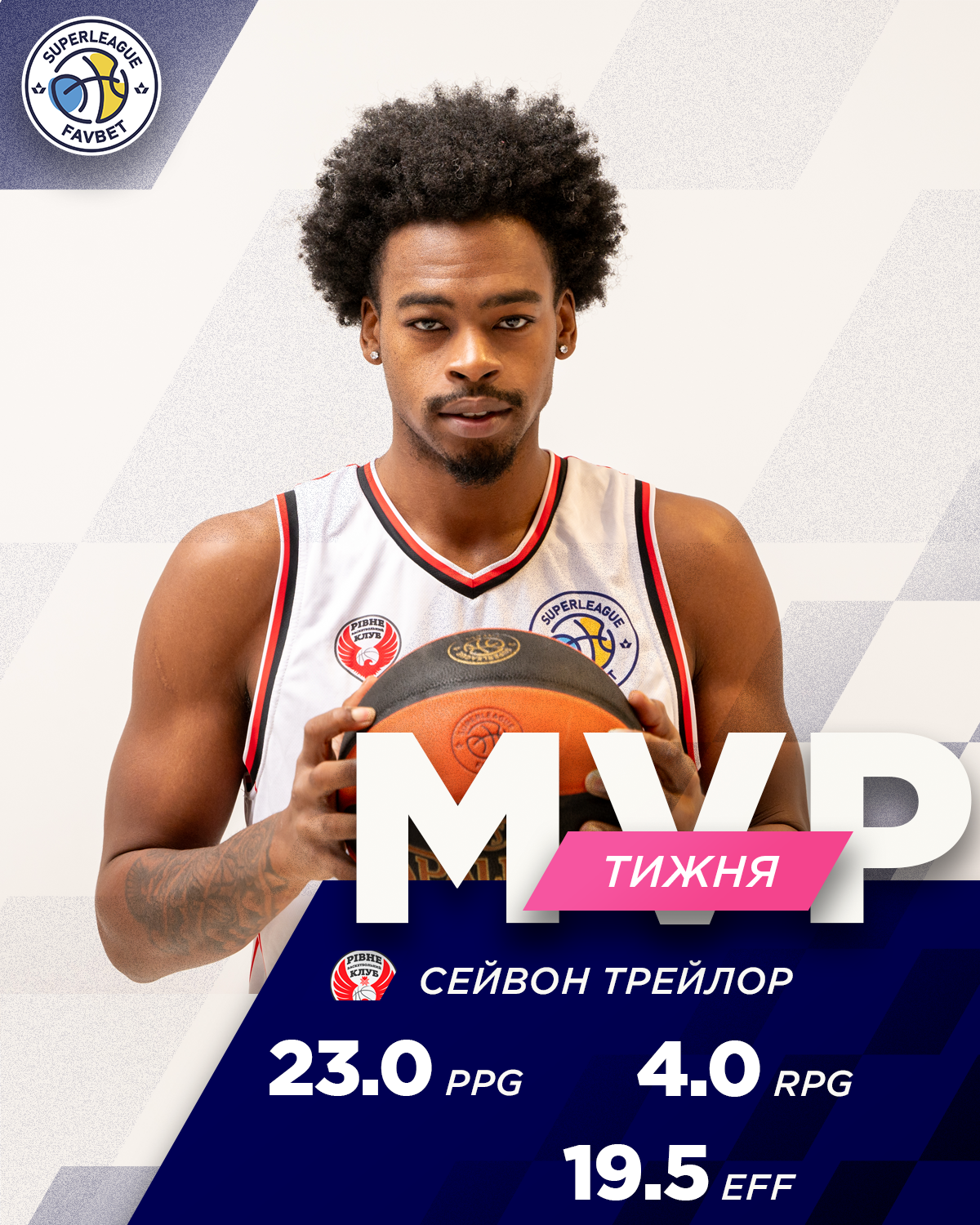 MVP тижня визнано захисника БК Рівне Сейвона Трейлора. Американець допоміг своїй команді оформити головну сенсацію сезону — перемогти Дніпро (91:90), набравши 27 очок на майданчику чемпіонів України. Також лідер Рівного набрав 19 очок у близькому матчі проти Запоріжжя (68:71). Трейлор — п’ятий кращий скорер Суперліги (17.8 очка) та четвертий кращий снайпер чемпіонату (39.1% реалізації триочкових при 7.7 кидках за гру).