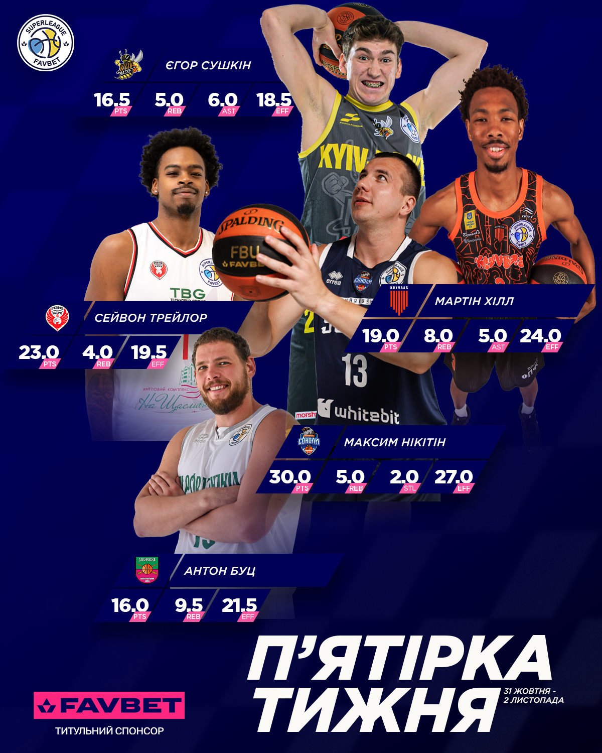 Єгор Сушкін (Київ-Баскет, 2 матчі) — 16.5 очка, 6.0 передачі, 5.0 підбирання, 3.0 перехоплення (РЕ 18.5)