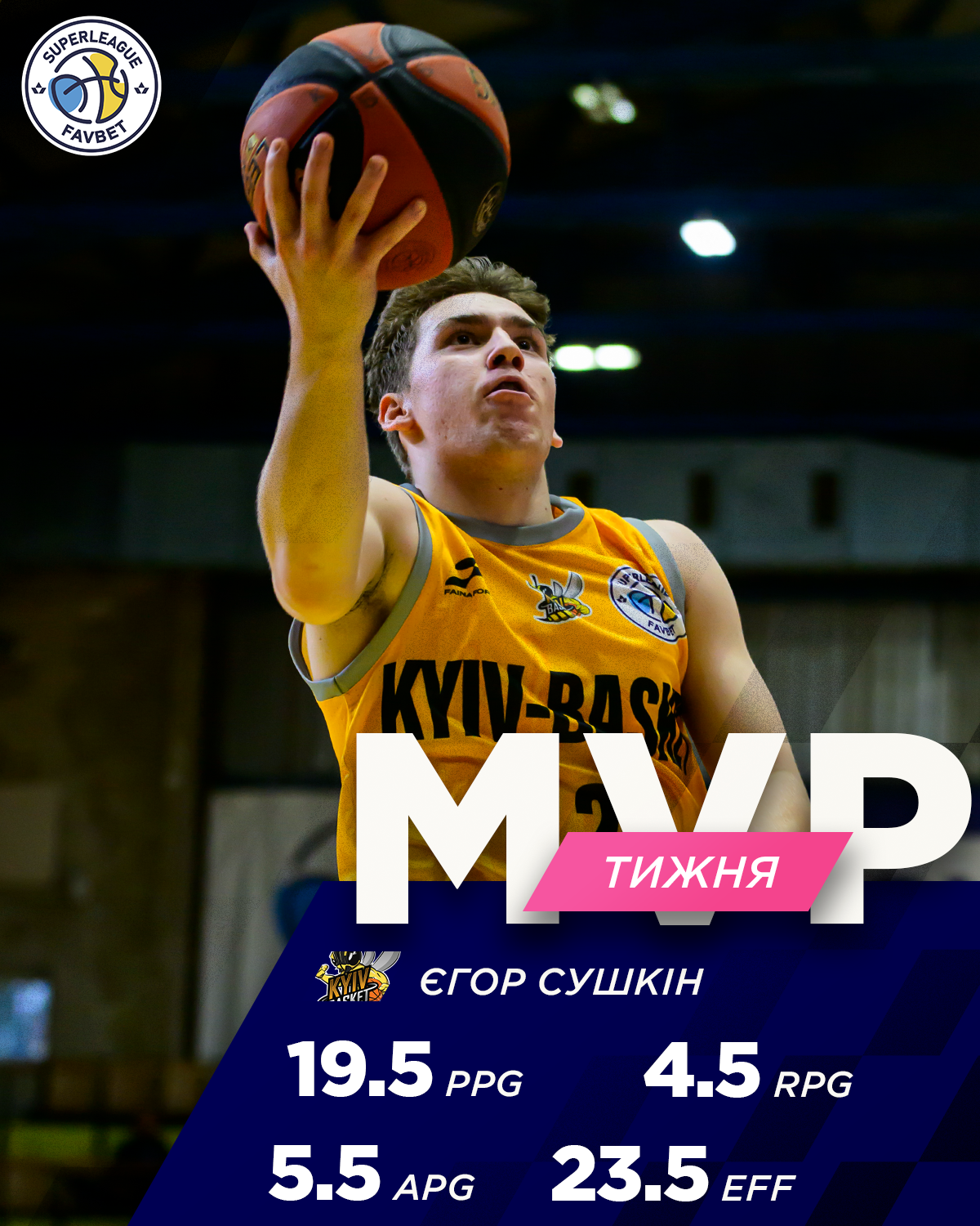 MVP першого туру регулярного чемпіонату Суперліги Favbet визнано розігруючого Київ-Баскета Єгора Сушкіна. В двох стартових матчах сезону захисник киян у середньому набирав 19.5 очка, а також записав до активу 5.5 передачі, 4.5 підбирання, 2.0 перехоплення (РЕ 23.5).