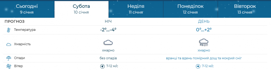 У суботу, 10 січня, температура повітря вдень коливатиметься від 0 до +2 градусів. Весь день буде хмарно, вранці та вдень очікується помірний дощ та мокрий сніг.