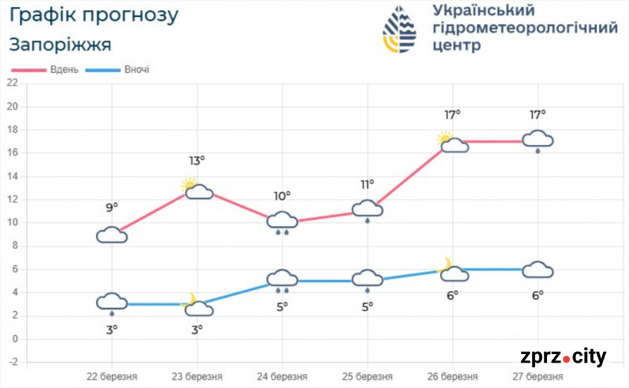 У понеділок, 23 березня, який збігається з Всесвітнім днем метеоролога, за даними Українського гідрометеорологічного центру, в Україні загалом очікується мінлива хмарність без опадів. У Запоріжжі ж небо від самого ранку затягнуть хмари, які не розсіються до вечора.