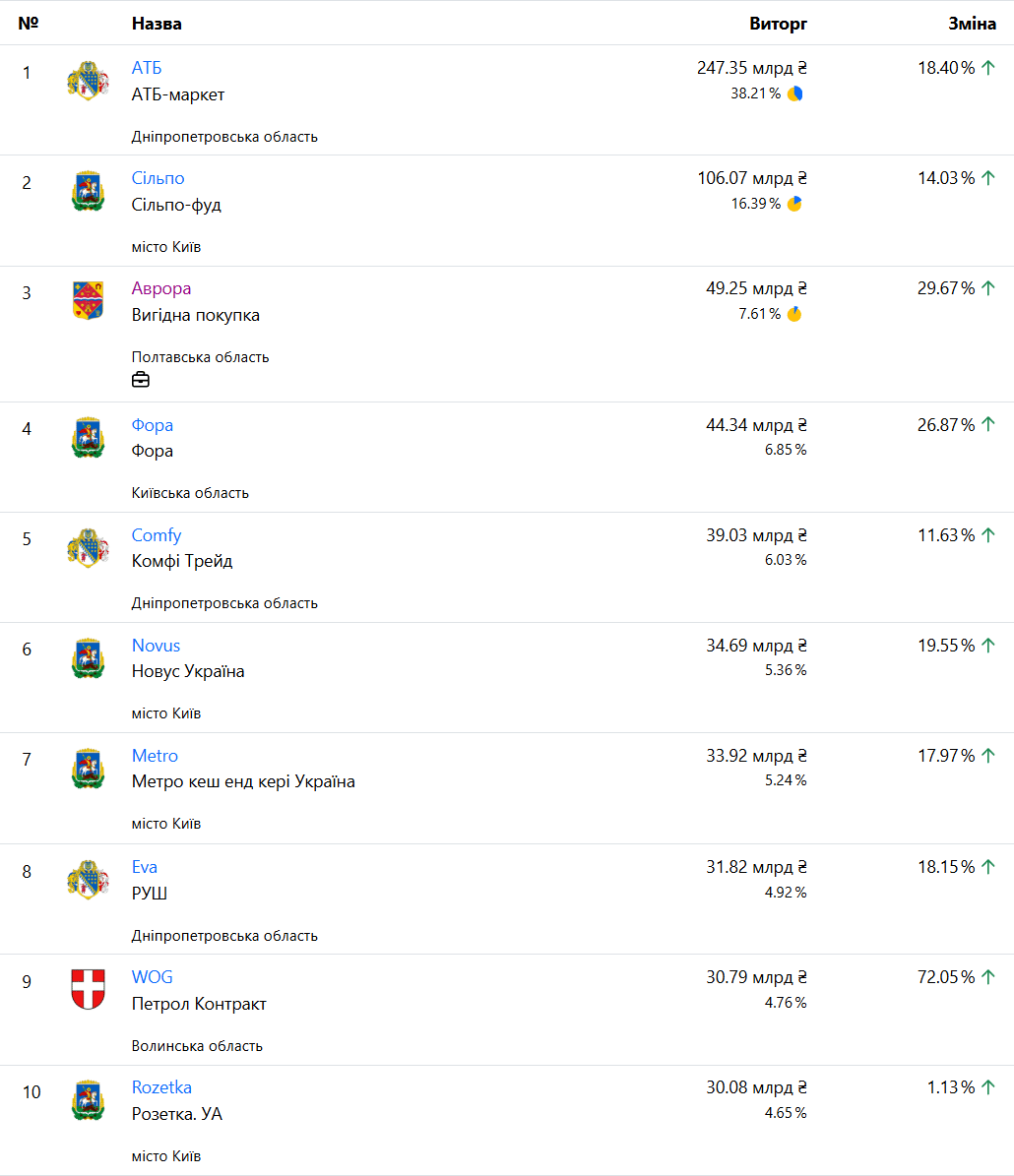 • Восьму позицію третій рік поспіль утримує мережа Eva (РУШ). Її дохід зріс на 18% до 31,82 млрд грн, проте прибуток впав на 21% — з 1,4 млрд грн до 1,1 млрд грн.