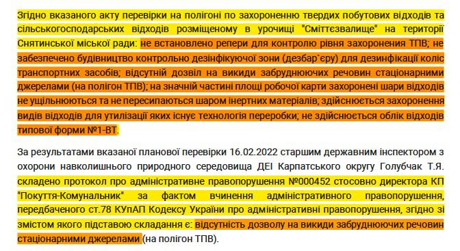 Перевірка інспекцією в лютому 2022 року виявила низку порушень: відсутність реперів, дезбар’єру, дозволу на викиди забруднюючих речовин, а також неущільнення відходів і захоронення матеріалів, що підлягають переробці.