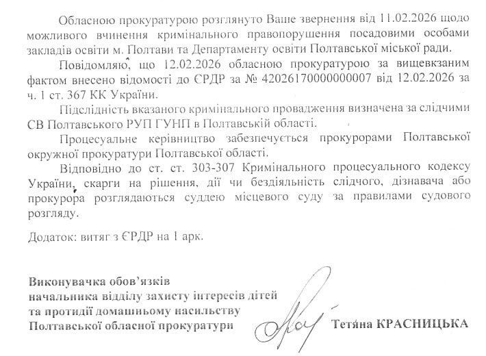 «Полтавщина» вирішила виправити цю прогалину. А тому написала звернення до поліції та прокуратури. Ми виходили з того, що директори навчальних закладів, педагогічний колектив та керівництво міського Департаменту освіти, будучи посадовими особами, не лише не перешкодили даним діям депутата, а й, скоріше за все, сприяли їм, організувавши збір дітей та надавши доступ сторонній особі (депутату) до неповнолітніх під час навчального процесу.